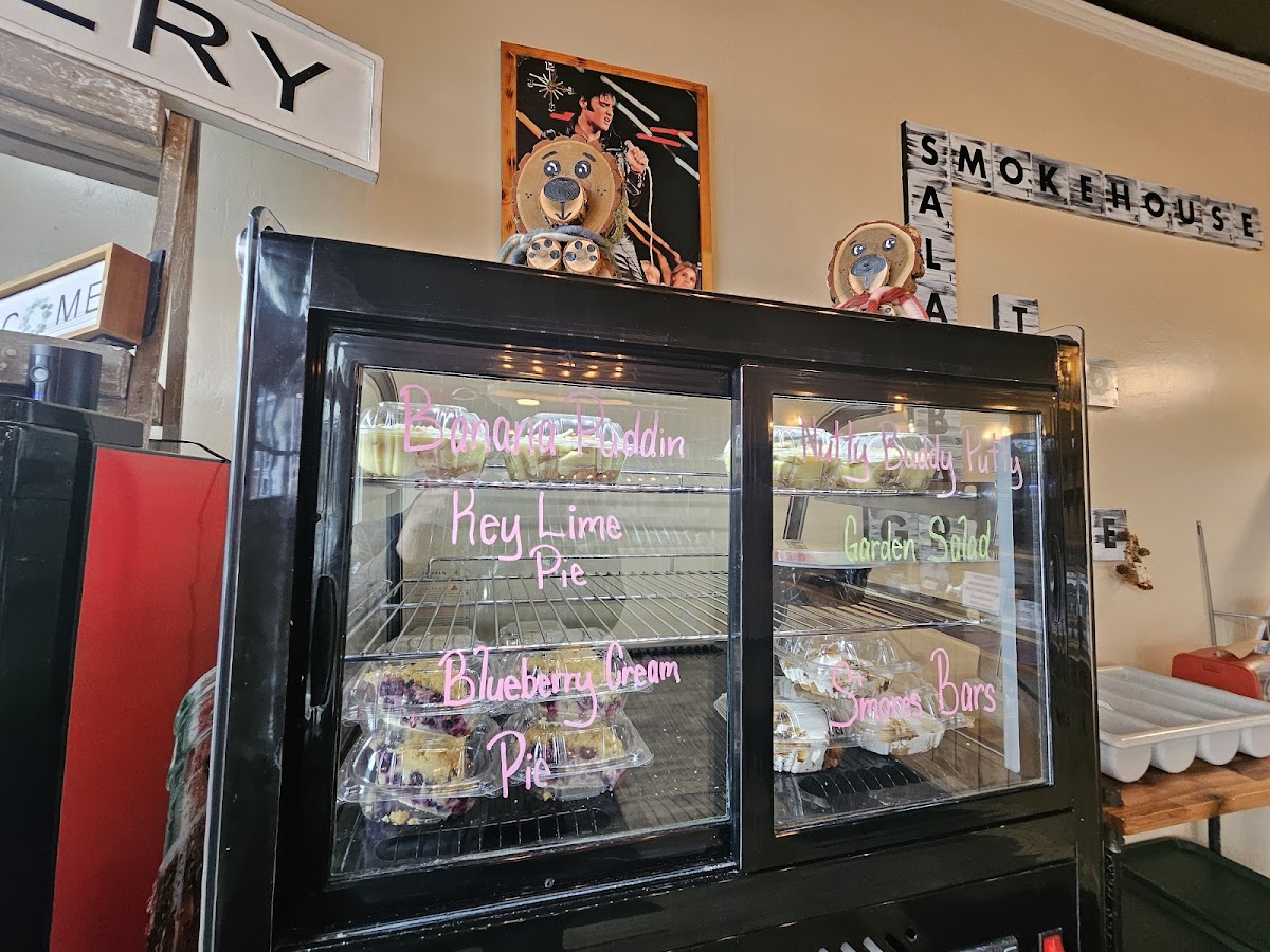 Smokehouse burger with choice of two sides: options include sweet potato casserole, parsley potatoes, baked beans, tater tots, green beans, cole slaw.